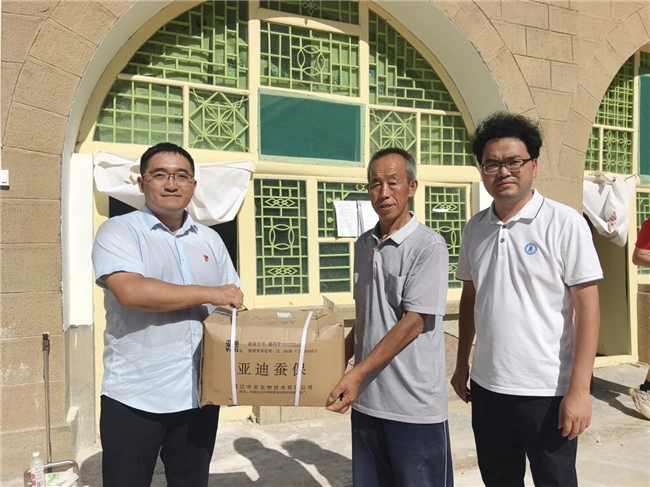 在西沟河村养蚕大户刘延寿家里,赵国栋老师现场演示了补催青技术的操作要点:“蚕卵补催青是确保蚕种整齐孵化、提高蚁蚕质量的关键环节。其核心在于精准调控温湿度、光线、通风情况,且操作中需保持环境清洁,确保孵化整齐度。通过科学操作,可显著提升蚕卵孵化率与蚁蚕发育情况。”在现场,赵国栋老师还给蚕农赠送了精心准备的蚕药,蚕农刘延寿表示:“之前我前往江苏科技大学学习了养蚕技术规程,但此次现场教学更直观、更贴合实际、更容易掌握。”